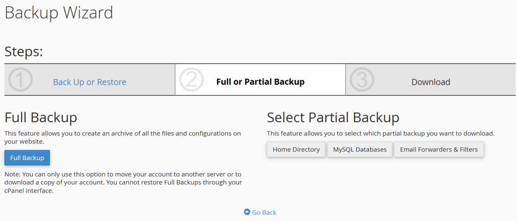 Choose the “Full Backup” option. Some cPanel interfaces may have a “Backup” option directly.