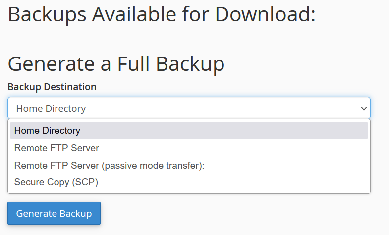 Select the backup destination. You can choose between “Home Directory,” “Remote FTP Server,” or “Remote FTP Server (Passive Mode).” The “Home Directory” is commonly used to generate Full cPanel Account Backup.